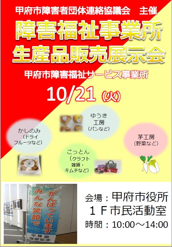 ==\🥐10/21㈫開催🍞/==  障害福祉事業所 生産品販売会 =============== 毎回好評☺️の 小さなマルシェ!!✨ ぜひお買い物に来てください😄 日時: 10/21㈫10:00〜14:00 会場: 本庁舎1階 市民活動室(ローソン横) #甲府市 #甲府 #kofu #障がい福祉 pic.x.com/6nqfD2W2pm