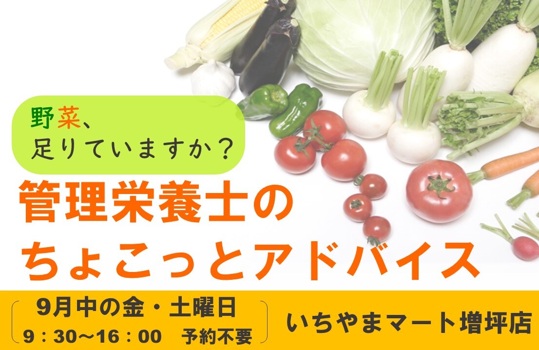 取り組み1⃣ ≪管理栄養士のちょこっとアドバイス・野菜の推定摂取量測定‼️≫ 9月の金・土曜日は… お買い物ついでに、食べている野菜の量を管理栄養士が食べ方のコツをお伝えします。✨ 🍅9月中の金・土曜日 9:30~16:00 🍅いちやまマート 増坪店 🍅予約不要です!! ぜひお立ち寄りください♪