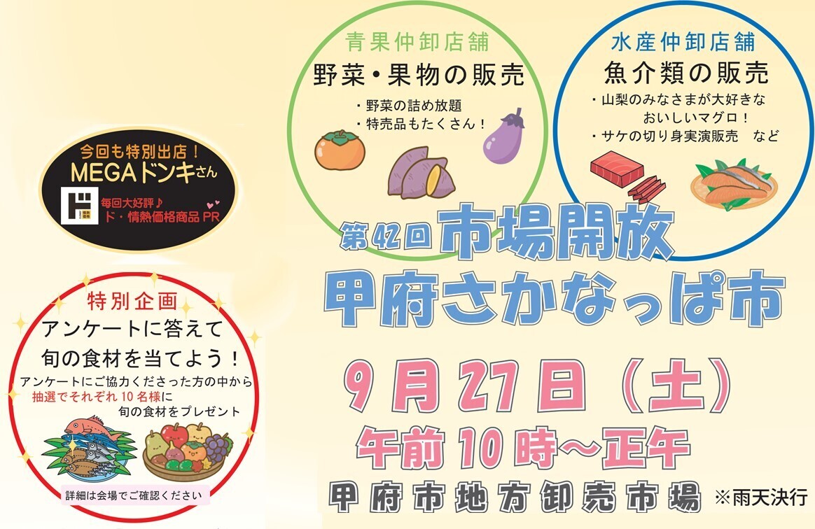 \《予告》9/27㈯開催‼/      第42回市場開放    🐟#甲府さかなっぱ市🥬 県民の台所である市卸売市場を一般開放します✨ 旬で新鮮な「さかな(魚)」と「なっぱ(野菜・果物)」のお買い物をぜひお楽しみください♪ 詳しくはコチラ👇👇 kofu-shijoukyoukai.jp/shijokyo/event… #甲府 #甲府市 #kofu pic.x.com/q274RcEmLw