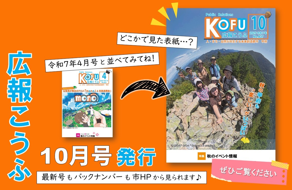 ☆———————————————☆ 📌「広報こうふ」を発行しました! ☆———————————————☆ 「広報こうふ」の10月号を発行しました。 💁‍♀️市公式ホームページからも見ることができますので、ぜひご覧ください! city.kofu.yamanashi.jp/shise/koho/koh… #甲府 #甲府市 #kofu #広報 #広報誌 #広報こうふ pic.x.com/qz1XVeN3x4