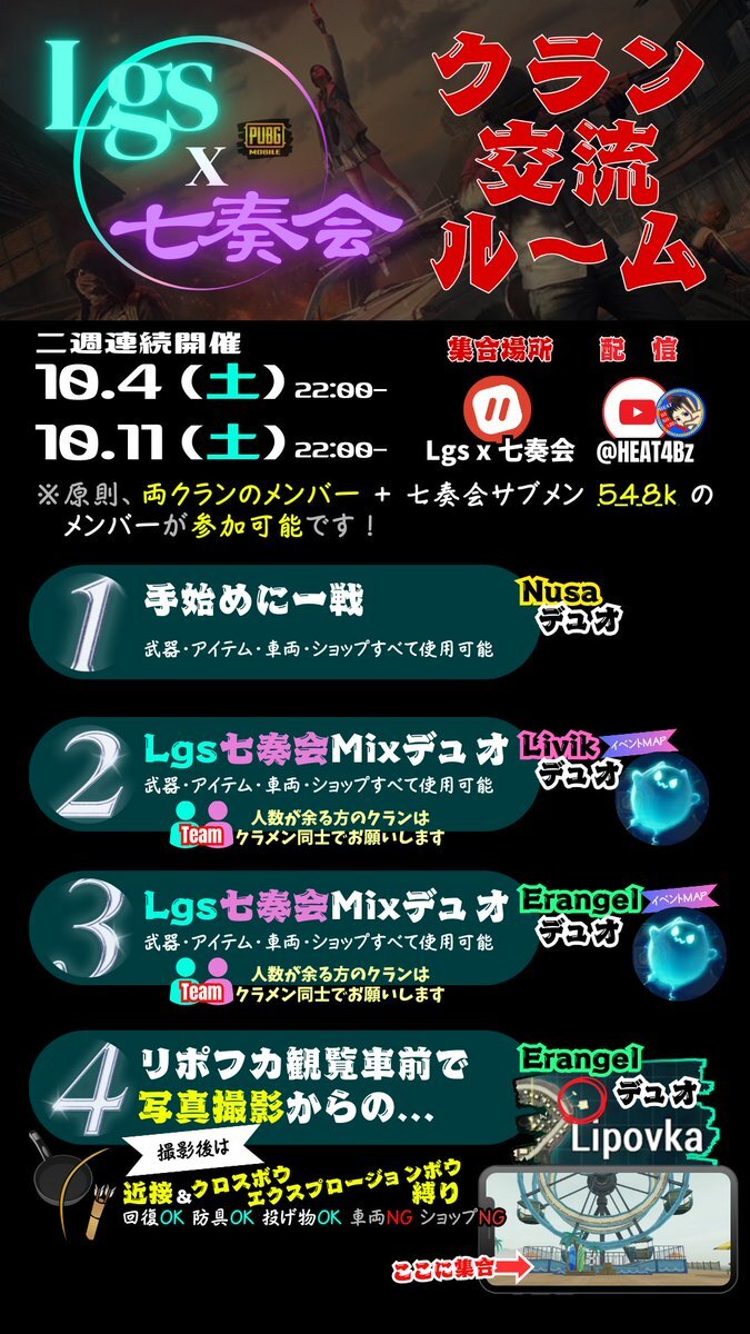 ▼━━━ 🔥Lgs x 七奏会🔥 クラン交流ルーム 二週目 ━━━▲ 🔴YouTube配信🔴 youtube.com/live/H3UqNdd9B… ※双方のクランメンバーおよび七奏会サブ548kメンバーのみ参加可能です! #PUBGモバイル