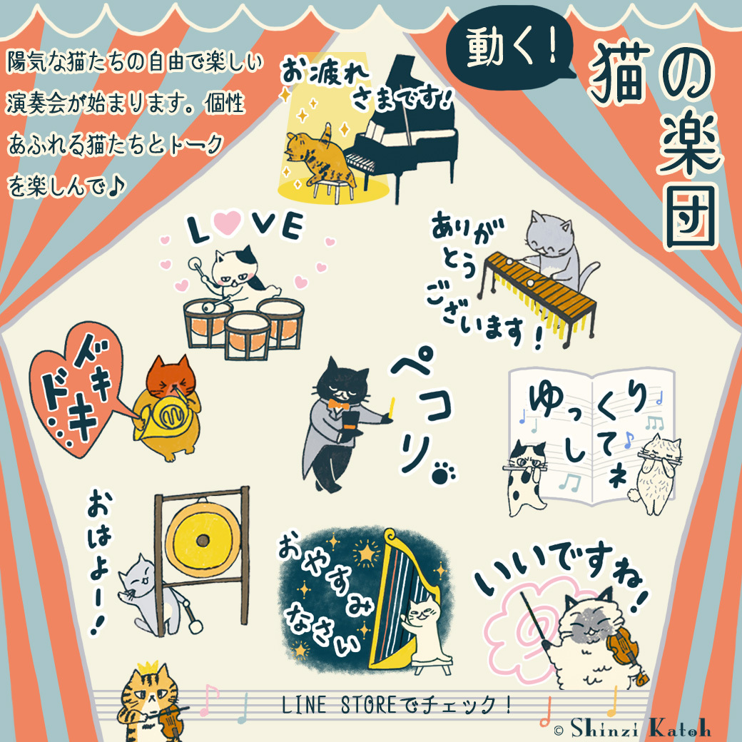 【#LINE 制作室より】新作 #LINEスタンプ 『動く!猫の楽団』がリリースしました✨ 陽気な猫たちの自由で楽しい演奏会が始まります。 個性あふれる猫たちとトークを楽しんで♪ line.me/S/sticker/3199… #ShinziKatoh #シンジカトウ #猫スタンプ #音楽スタンプ #LINEスタンプ宣伝部 #音楽 #cat pic.x.com/Ox1CB9zSz3