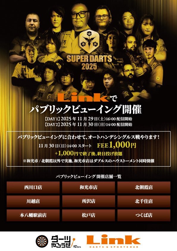 🎯 SUPER DARTS 2025 パブリックビューイング開催! Link北千住店で DAY1▶️ 11/29(土)16:00〜 DAY2▶️ 11/30(日)14:00〜 一緒に熱く応援しよう🔥 さらに11/30(日)14:00〜 オートハンデシングルス戦🎯 参加費1000円 +1000円で終日投げ放題✨ #SUPERDARTS2025 #ダーツ #北千住 #Link pic.x.com/B0kH5lhAVj