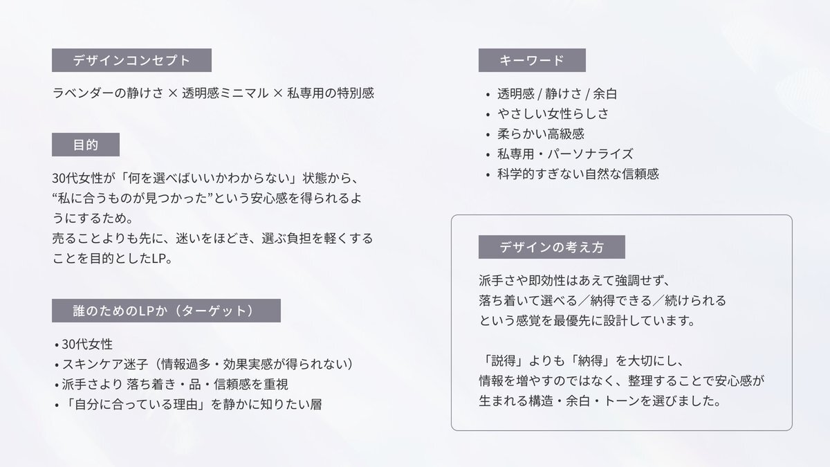 【自主制作】 ◆パーソナライズスキンケアLP ◆ ◼︎ターゲット:30代女性/スキンケア迷子 ◼︎デザインコンセプト 静かに納得できるLPを目指し、「ラベンダーの静けさ × 透明感ミニマル × 私専用の特別感」を設計。 落ち着きと信頼を感じながら、安心して選べる雰囲気を大切にしました。 #LP pic.x.com/iZraq7uwU6