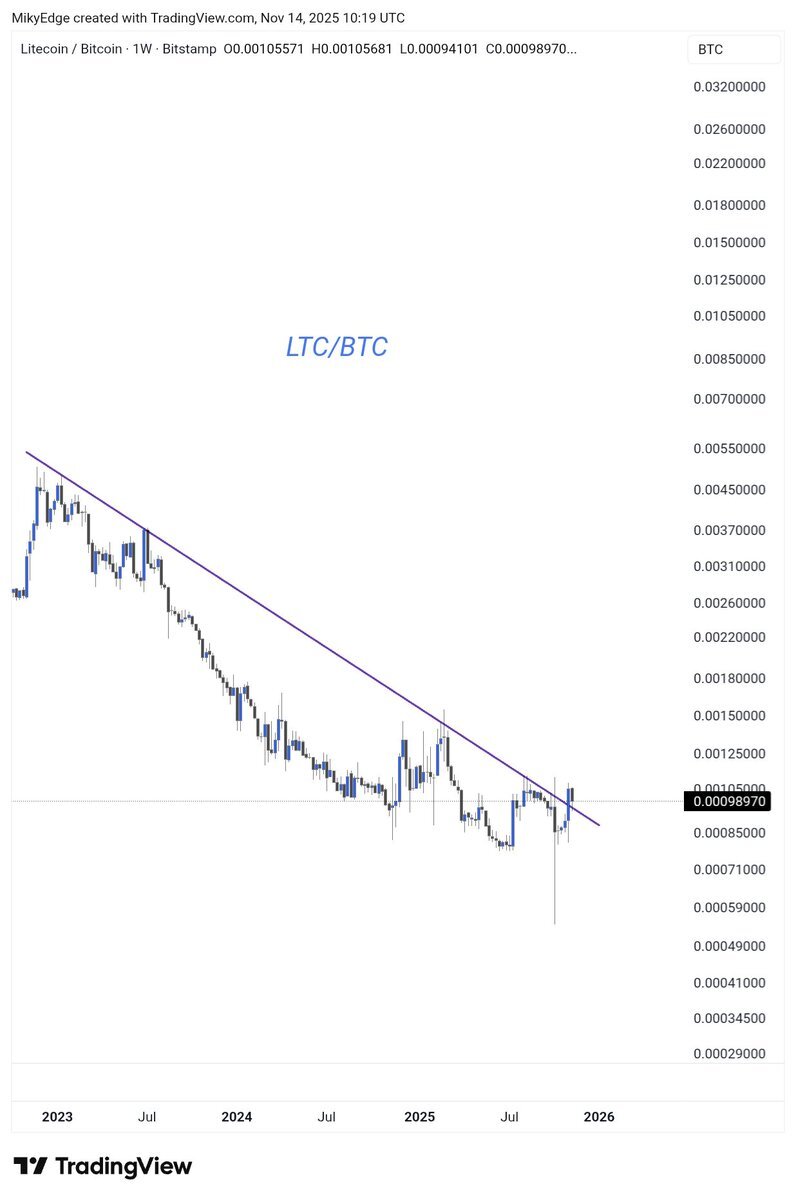 今から買うならビットコインよりもライトコインがオススメです。正直NEXTリップルなので、本当に心からライトコインをオススメしてます。そしてBTC比でも2023年からのトレンドラインを上抜け。もう言ったからね!笑(くどくてゴメン) #LTC #ライトコイン #BTC pic.x.com/PNnhEvxxHl