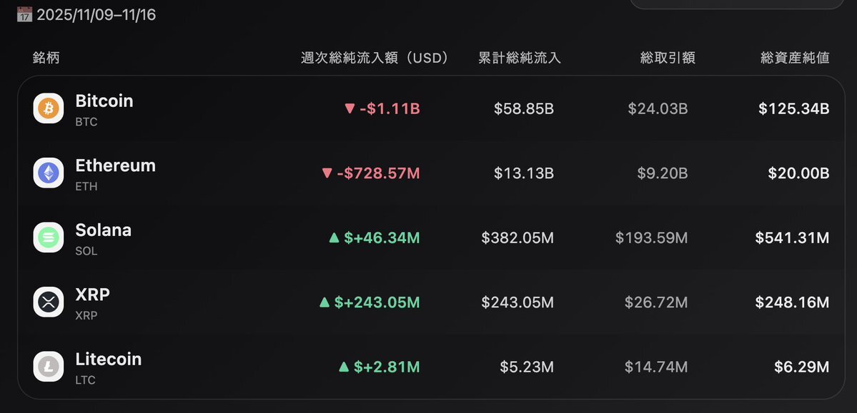 先週の仮想通貨ETFフロー📊 (2025/11/09〜11/16) #BTC  -$1.11B #ETH  -$728.57M #SOL  +$46.34M #XRP  +$243.05M ← 初登場で強烈にプラス #LTC  +$2.81M 今週はなんと言っても XRPの圧倒的な資金流入が主役🔥 ソラナはこの下落相場でもずっとプラスで流入してます🚀 #BTC #ETH #SOL #XRP pic.x.com/gY3OAs2W2K