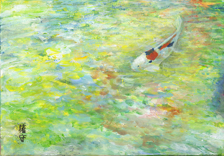 初夏 2017年 アルキド樹脂絵具、白亜地、キャンバス 158×227mm 個人蔵 #絵画 #風景画 # #pond #art #painting #landscape # #carp pic.x.com/Q0zfY8PGct