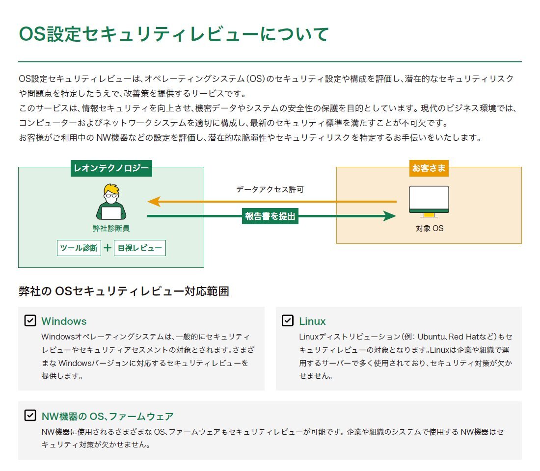 / レオンテクノロジーの 【#OS設定セキュリティレビュー】とは? \ --------------------------------------- ・ #Windows ・ #Linux ・ #NW機器 ・ #ファームウェア など、 様々な対象をチェックできます✅ ▼診断項目の例 ・ パッチ適用状況 🛡️ ・ サービスの公開設定 🌐 ・ ログ保全設定 ✍️ ・ pic.x.com/Tf3yFxxd85