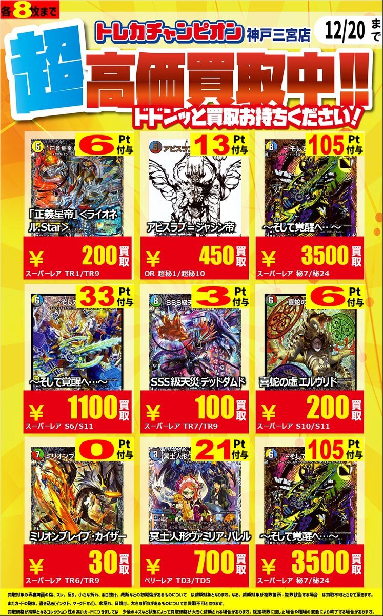 【#デュエルマスターズ】 #LOVE&ABYSS 現在の買取表になります💹 買取表\(`・ω・´)/ドーン 🉐会員様は買取金額の3⃣%ポイント付与🉐 お持ち込みお待ちしております🙇♂️ #トレチャン神戸三宮高価買取 pic.x.com/h5UBQuPUtB