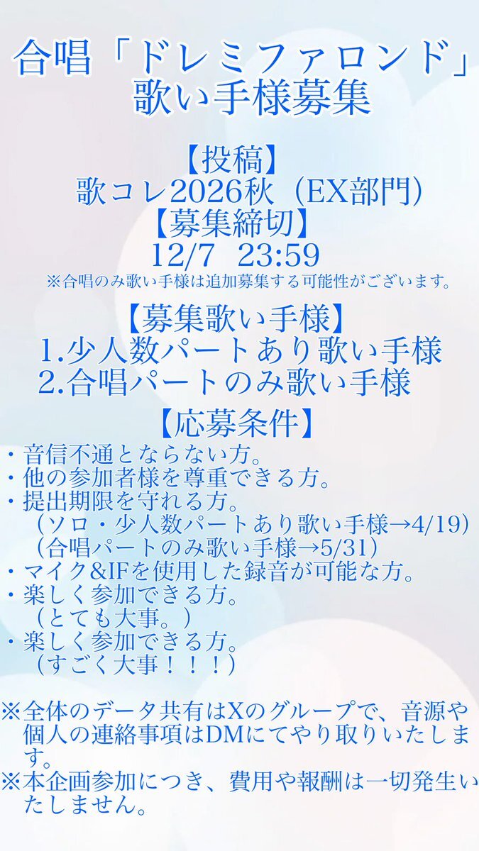 【歌コレ2026秋 EX部門合唱参加歌い手様募集】 〜みんなでニコニコできる作品を✨〜 ニコニコ代表のくりたしげたか様に歌い手デビューしていただきます!!! なんてこったー👀! 楽曲:「ドレミファロンド/40㍍P様」 こちらの合唱企画に伴い、歌い手様を募集いたします。 募集は以下になります。