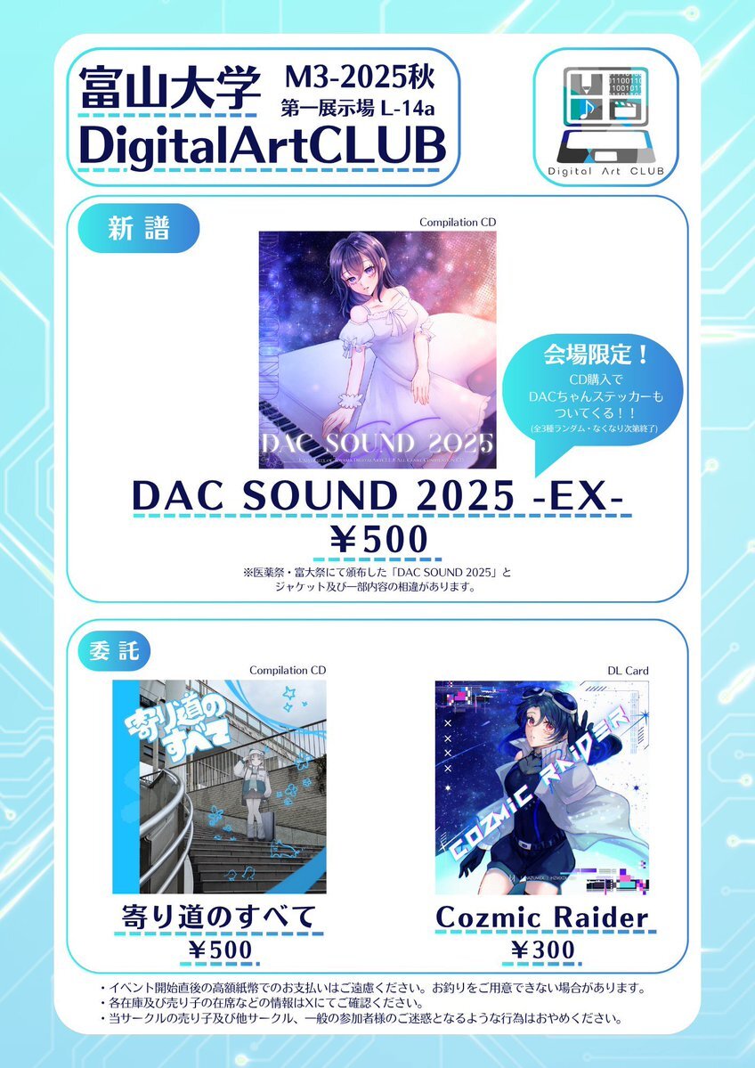 【#2025秋M3 告知】 2025.10.26(sun) 2025 M3秋 スペース :第一展示場 L-14a サークル :富山大学DigitalArtCLUB 富山大学DigitalArtCLUB様にて、委託販売! 収録曲6曲は全て『旅行』をコンセプトに制作されております。 会場でお会いしましょう! #M3秋 #M3秋2025告知 pic.x.com/FXO3Wqq18V
