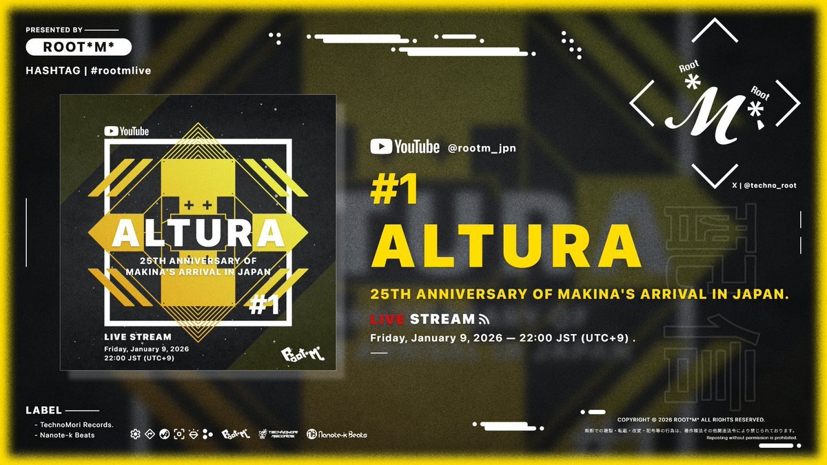 【配信告知】 ALTURA -25th Anniversary of Makina’s Arrival in Japan- Makina伝来25周年を記念して開催されたイベントでの出演セットを、再現DJ配信としてお届け! ※後日SoundCloudにアップロード。 🗓️2026/01/09(金) 22:00~予定 📍YouTube Live #rootmlive #Makina youtube.com/live/81DnfZ08f… pic.x.com/PuhXAEu41P