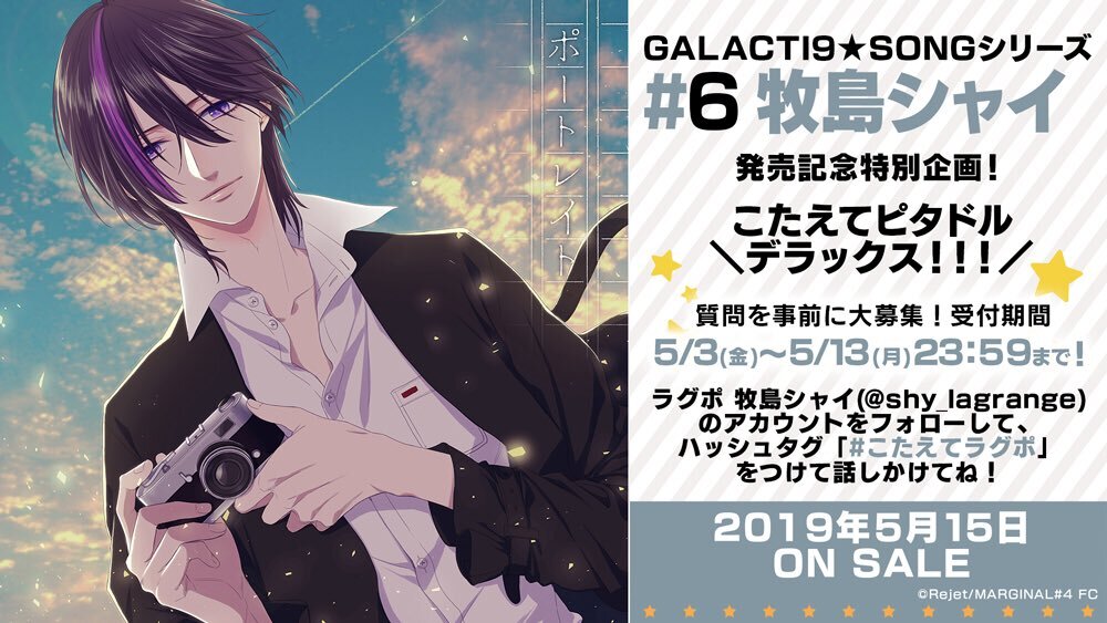 \✨ご予約はお早めに✨/ 【ピタゴラスプロダクション】 GALACTI9★SONGシリーズ #6 牧島シャイ(#豊永利行) 新曲試聴公開中🎶 ★ポートレイト ★パルコ(Shy Ver.) SP動画も配信中! x.com/pythagoras_inf… 5/15(水)発売予定! 楽曲試聴はコチラ⇒marginal4.net/galacti9/ #mg4 pic.x.com/bEJcBVirPg