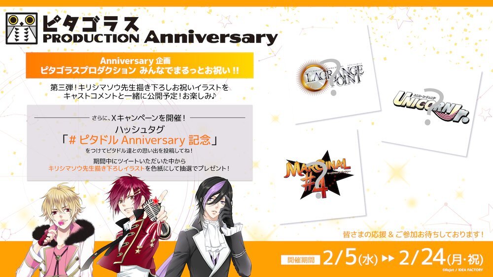 #ピタドルAnniversary記念🥂🌈】 ピタゴラスプロダクション みんなでまるっとお祝い!! 2/13は MARGINAL#4 デビュー記念日✨ キリシマソウ先生描き下ろしお祝いイラスト大公開! 皆さんおめでとうございます🎵 #mg4 #マジフォー #ピタドル pic.x.com/QtIRq7zTao