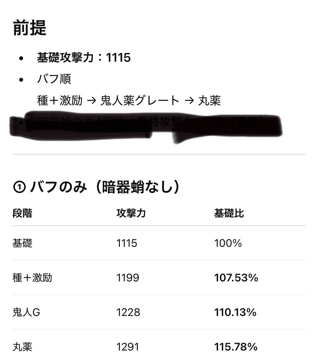 暗器蛸の力・四部位込みの時点で すでに攻撃力が高く、バフの伸び代は最大でも +13.6% 1296 = 基準比 113.6% が限界 実戦向け結論(暗器蛸4前提) 最小構成:こんがり肉 + 鬼人薬グレート、丸薬・種→ 上限到達後は完全に無意味。 %効率が一番高いのは、こんがり肉(+11%) #MHWilds #mhwi pic.x.com/BQxQLOZd6C