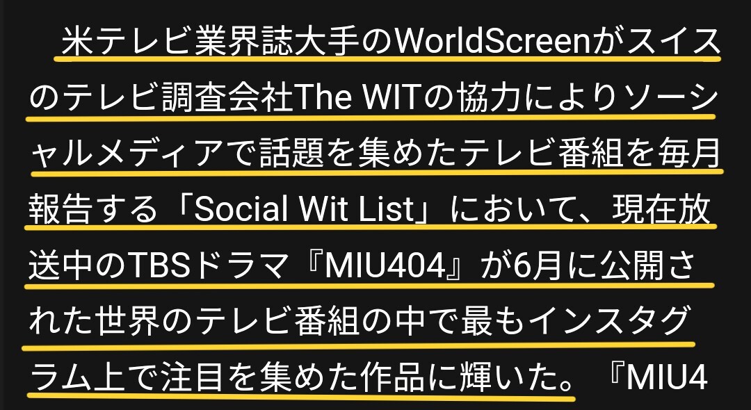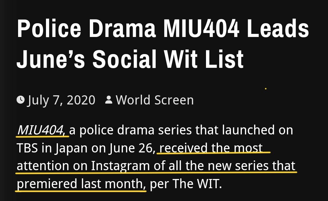 米国の世界大手映画情報誌「World Screen 」が発表したレポートによると、「#MIU404」は放送後、インスタグラム上で全世界で最もフォローされているドラマとなり、当時インスタグラムで最も人気のあるドラマとなった。 名実相伴う、おめでとうございます!👏 #星野源 worldscreen.com/police-drama-m…