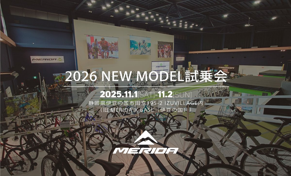 【MERIDA試乗会情報】 2025年11月1日(土)~2日(日)静岡県伊豆の国市のIZU VILLAGE(旧 MERIDA X BASE(伊豆の国))にて2026モデル大試乗会を開催いたします! ロードバイク、MTBはもちろん、クロスバイク、キッズバイク、E-BIKEの最新モデルをご体験いただけます!