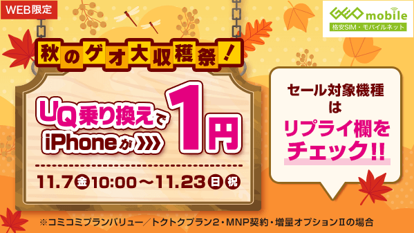 WEB限定 🍁🍠✨゜+.――――――+.゜ 秋のゲオ大収穫祭! UQ乗り換えでiPhoneが1円! ゜+.――――――+.゜✨🍠🍁 最近 毎日寒い…🥶 けど、ゲオモバイルのWEB限定セールはアツい🔥🔥 #乗り換え(#MNP)で 📱中古 #iPhone12 が なんと…驚きの価格に!😱💥 さらに#iPhone11や#iPhone12mini対象の詳細はこちら👇 pic.x.com/h7CKvgauEK