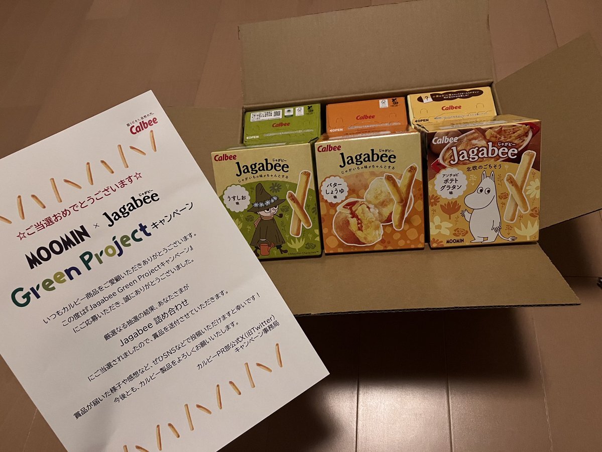 カルビーPR部公式様(@calbee_PR )より 当選していたMOOMIN×Jagabee GReeN ProjectキャンペーンのJagabee詰め合わせが届きました🎁 外箱の絵柄も可愛いし3つの味を楽しめるのが嬉しいです♡ ありがとうございます!! #葉都紀の当選報告 #カルビー #Jagabee #MOOMIN pic.x.com/rOWhanXZMk