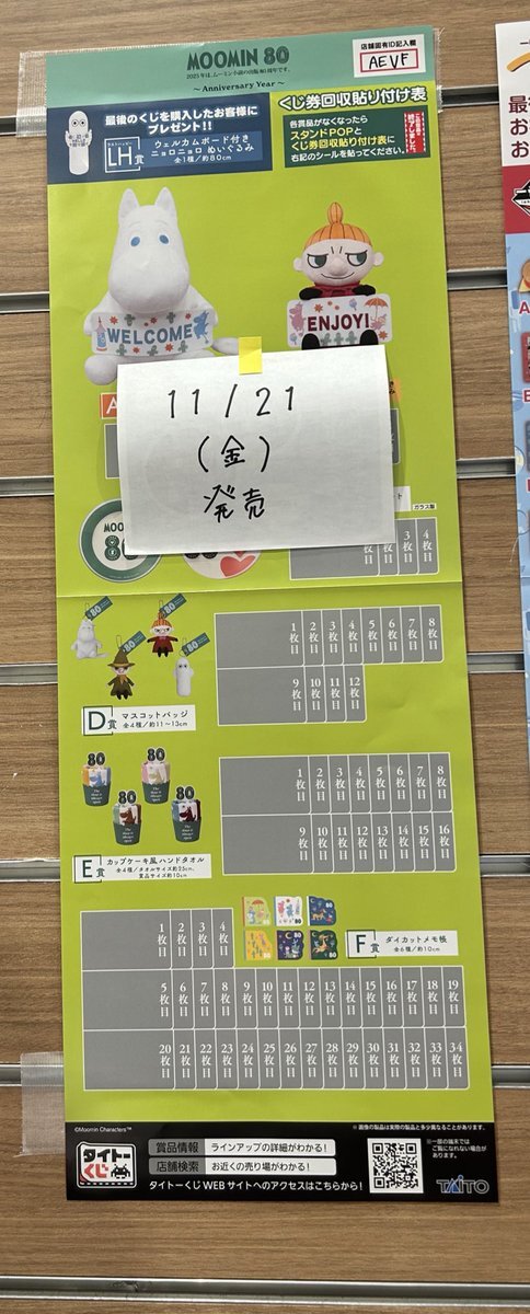 【タイトーくじ】 #タイトーくじ #MOOMIN 明日10時開店と共に発売開始です✨ 今年はムーミンの小説出版80周年らしいです😃 長いですよね✨ 是非引いてくださいね✨ #ふるいち #イオンモール宮崎店 pic.x.com/K4EJLtro5p x.com/taito_kuji/sta…