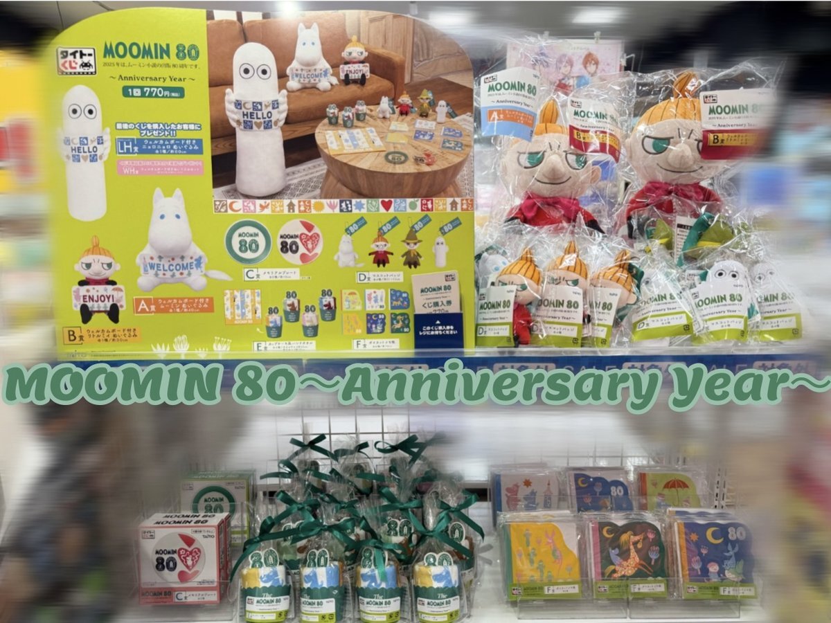 /  ⭐️#タイトーくじ ⭐️  MOOMIN 80 ~Anniversary Year~  11/21(金) 販売開始です♩.*・゚ \ 80周年ロゴやアートを使用したぬいぐるみや おしゃれな雑貨アイテムがラインアップ✨ みなさまのご来店 お待ちしています😊💞 #MOOMIN #ムーミン80周年 #バンダレコード #イオンモールつくば pic.x.com/RtwGhocdAO