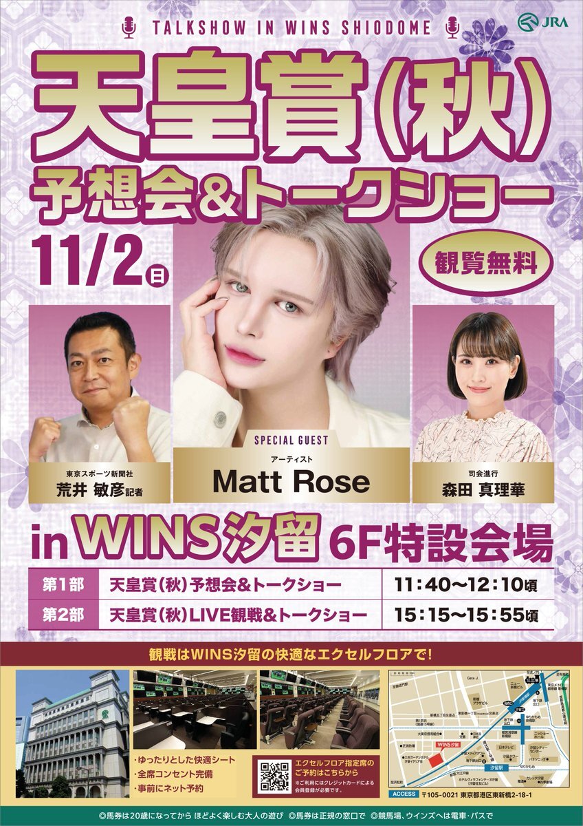 【天皇賞(秋)予想会&トークショー in WINS汐留】 11月2日(日)天皇賞(秋)当日、アーティスト #Matt Rose さんをお迎えして、予想会&トークショー・LIVE観戦を開催します🏇 この機会に是非、#ウインズ汐留 にお越しください! #ウインズ #天皇賞・秋 #トークショー #イベント pic.x.com/mzeiTvMZ89