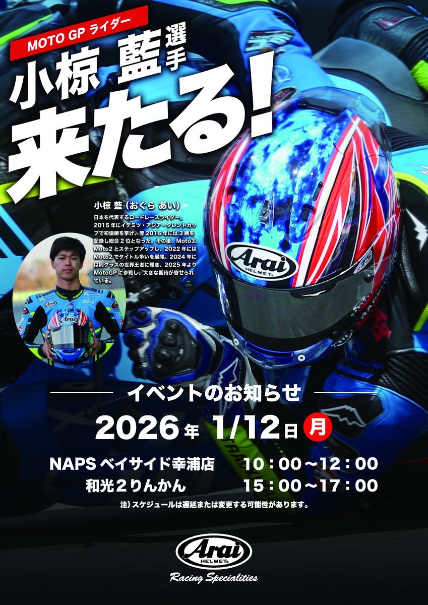 【NEWS】AraiHelmet Presents 2026年 1/12祝月 小椋藍選手のトークショー&サイン会開催 いよいよMotoGPライダーとなった小椋選手に色んな話を聞けるのが楽しみ🔥 今年もMCを担当します! 基本的には各店舗でOGURAレプリカをご購入・ご注文の方が優先です #アライヘルメット #小椋藍 選手 #MotoGP pic.x.com/6Jt5He4zj7 x.com/araihelmetjapa…