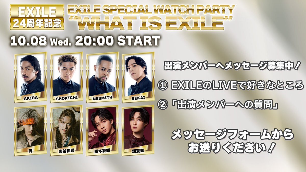 #LDHLIVESQUARE #EXILE24周年 企画 🪩WATCH PARTY🪩◢ 📬お便り募集中 forms.gle/ZzcdwuTZ1e5mgR… 💎会員限定&生配信中にコメントくれた方へ 📸直筆サイン入りチェキ🎁get🎯 出演 #AKIRA #SHOKICHI #NESMITH #世界 # #岩谷翔吾 #澤本夏輝 #堀夏喜 🗓️10/8(水)20時〜生配信📺 #EXILE @EXILE_Staff pic.x.com/9q532JIYwn
