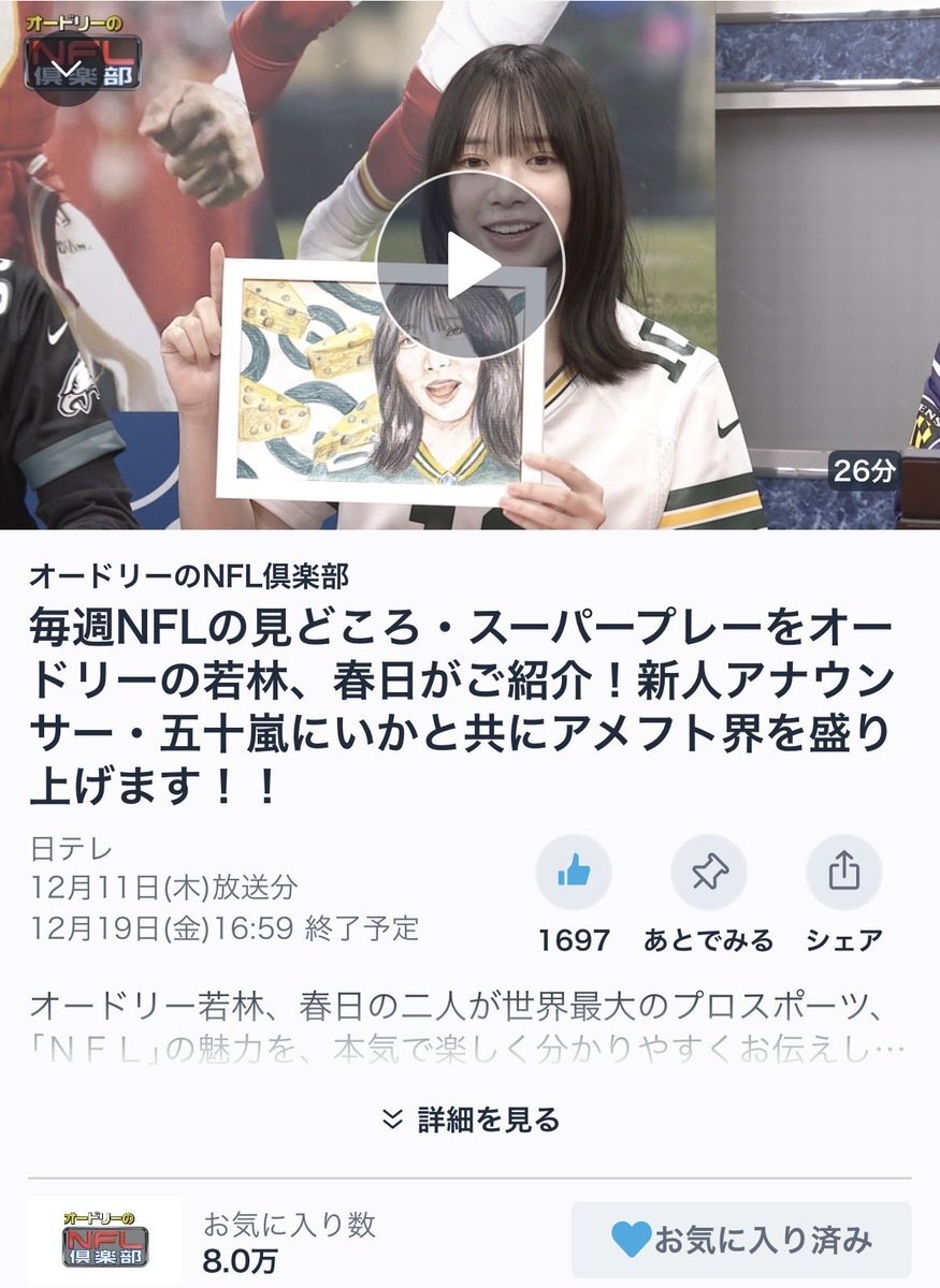 日本テレビ「オードリーのNFL倶楽部」 毎週NFLの見どころ・スーパープレーをオードリーの若林、春日がご紹介!新人アナウンサー・五十嵐にいかと共にアメフト界を盛り上げます!! #TVer #NFL倶楽部 @nflclubofficial tver.jp/episodes/epl43…
