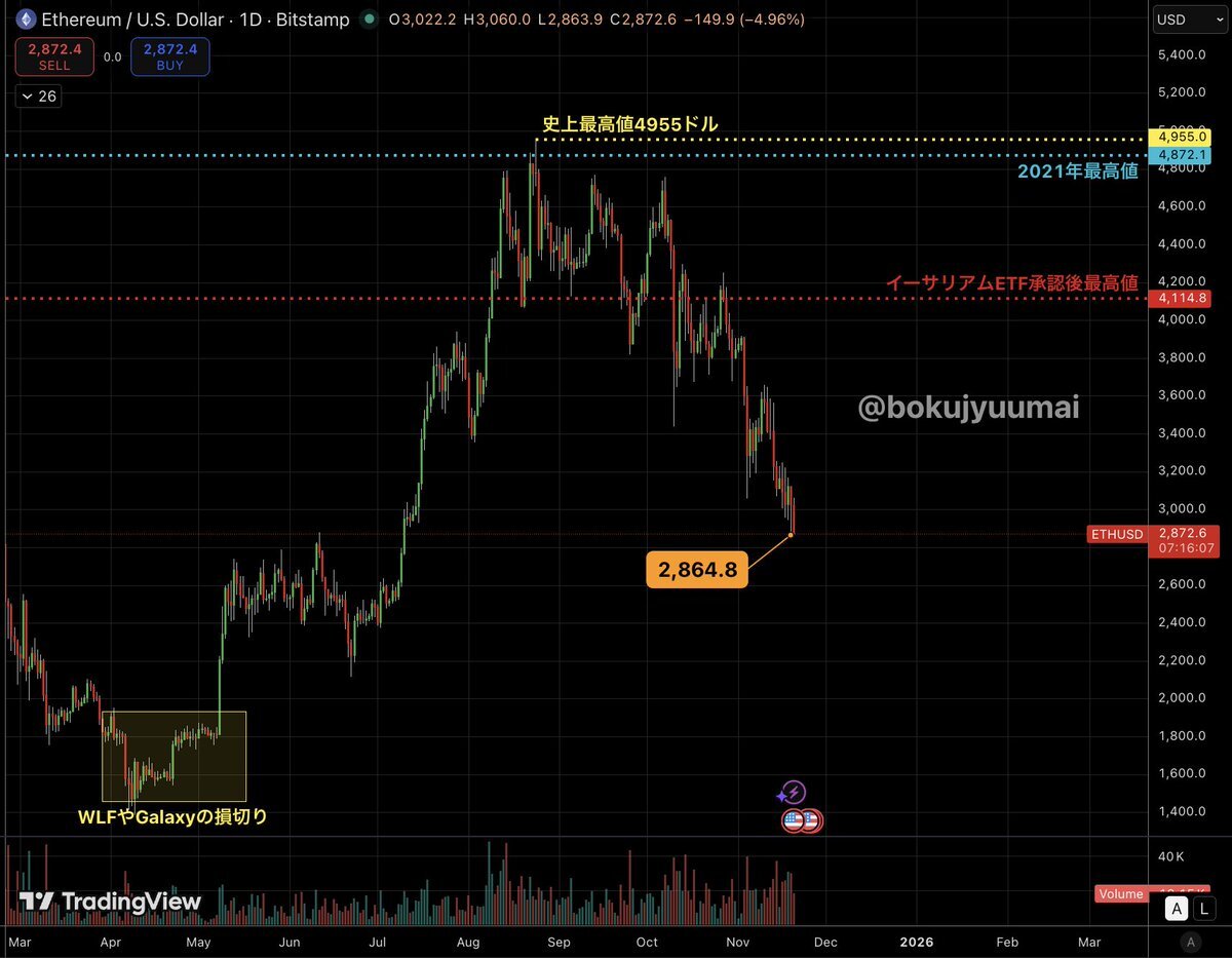 ETH速報:イーサリアムついに2900ドル割れでアルトコインが死屍累々😇イーサリアム準備金採用のトレジャリー企業はNAV合わせて試練の時🤔 トランプショックででQE(量的緩和)はよ! #イーサリアム #仮想通貨 #暗号資産 #DeFi #NFT #ビットコイン pic.x.com/kyuigPNibP x.com/bokujyuumai/st…