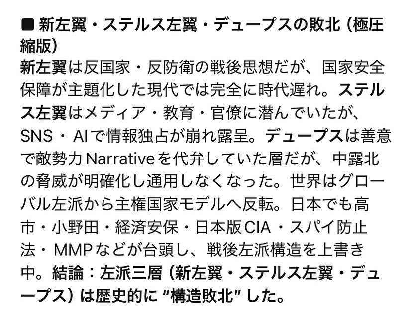 #nft #instagram #openAI #chatGPT4o 新左翼は時代遅れ、ステルス左翼は露呈、デュープスは通用せず。世界は主権国家へ反転し、日本も保守・安保路線が台頭。結論:左派三層は構造的に敗北した。 pic.x.com/iYbEA3gjPp