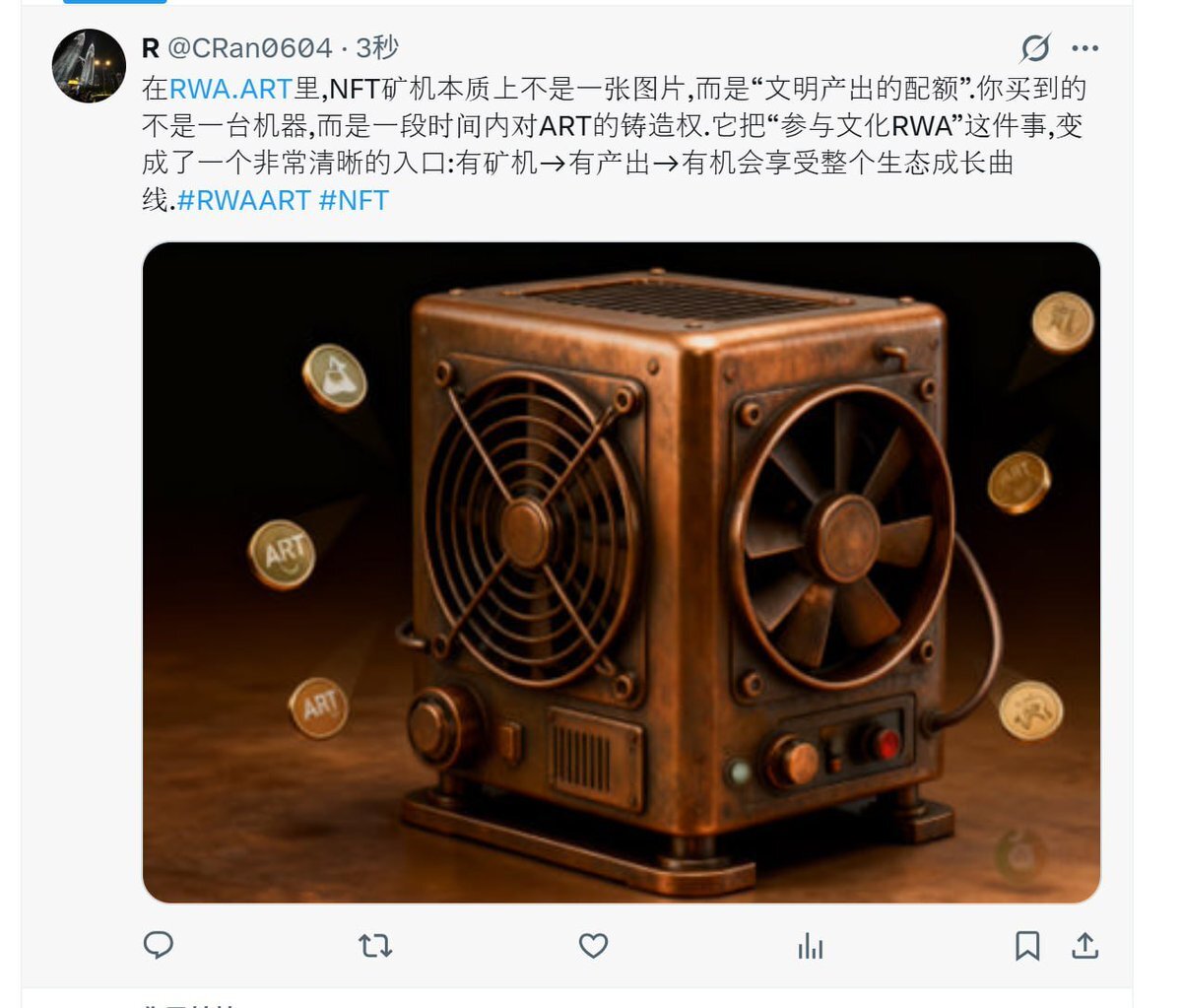 RWA.ART里,NFT矿机本质上不是一张图片,而是“文明产出的配额”.你买到的不是一台机器,而是一段时间内对ART的铸造权.它把“参与文化RWA”这件事,变成了一个非常清晰的入口:有矿机→有产出→有机会享受整个生态成长曲线.#RWAART #NFT