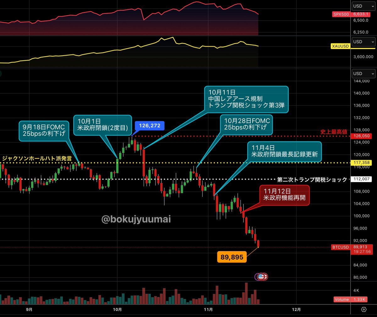 BTC速報:ビットコイン9万ドル割れ、米政府閉鎖が最長記録で終了し、徐々に再開するも割れたくない92000ドルをあっさり割れる。トランプバブル終了か😇 #ビットコイン #仮想通貨 #Bitcoin #暗号資産 #イーサリアム x.com/bokujyuumai/st…