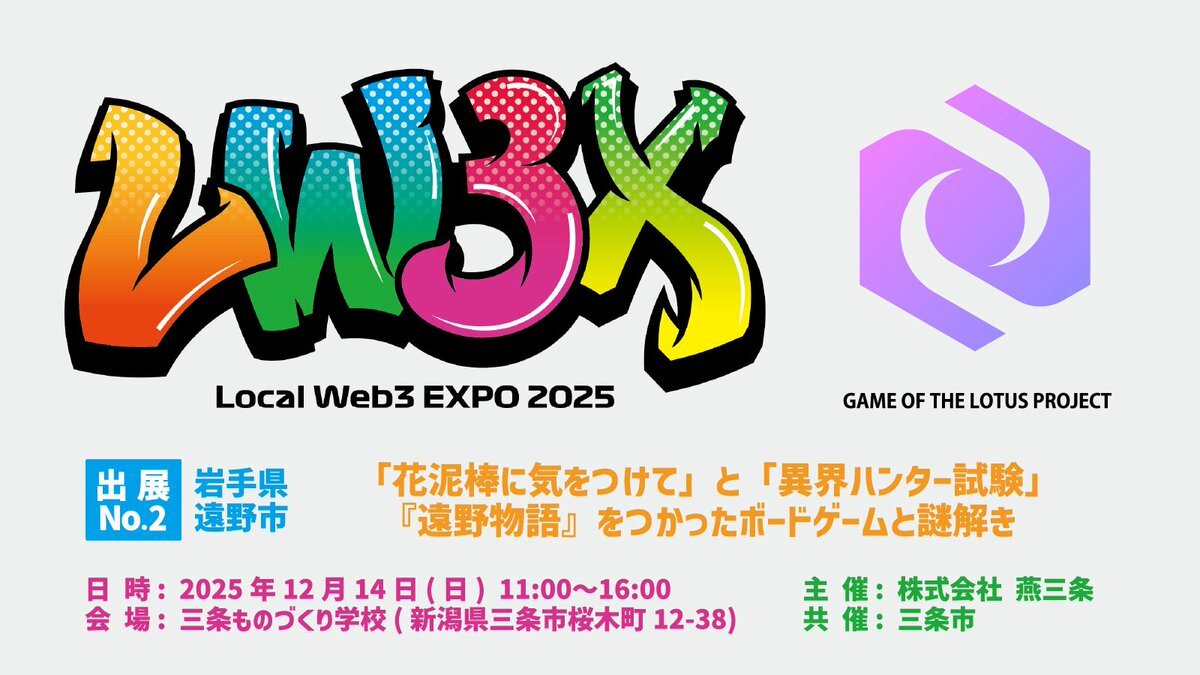 地方の未来をWeb3で考える見本市 ! 全国から10の先進地域が燕三条に集結する 【Local Web3 Expo 2025】 2025年12月14日(日)11:00-16:00 出展地域をご紹介 岩手県遠野市からあの「遠野物語」を題材にWeb3で地域の物語を紡ぐプロジェクト 出展No.2 GAME OF THE LOTUS PROJECT #LW3E #デジタル三条市