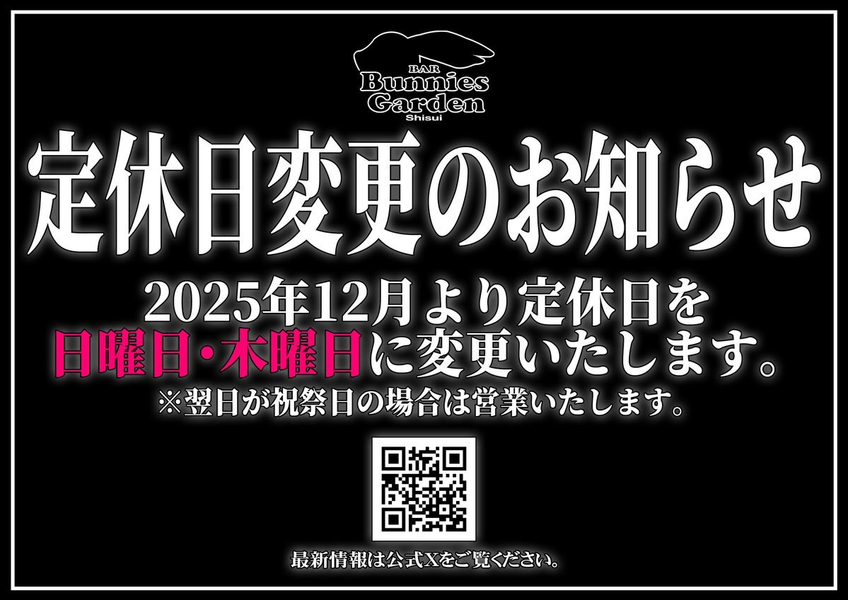 【bunnies garden】 営業形態変更のお知らせです。 12月11日から定休日を『日曜日』と『木曜日』に変更させて頂きます。 それに伴い月曜日は「2人体制」金曜日は「3人体制」となります。(たまに曜日変更あり) さらに日曜日は2026年1月より「予約客カウンター席のみ」で営業予定です。 #女装 #NH #BAR pic.x.com/4Iwr3RgIVC