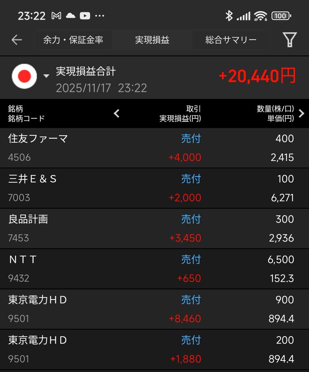 100万円現物デイトレ 11月17日 20,440円 デイトレ始めてからまだ負けなし 昨日のNTTの件 640円の利益のはずが、損益でマイナス5000円?は解決した。 実際は利益出てるけど、税法上取得平均の小数点切り上げでマイナスになり、 上手に活用すればとても節税になる!! #株式投資 #デイトレ #NTT pic.x.com/9nVY3PE7hx