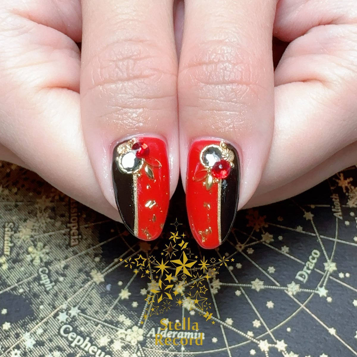 モチーフネイル 後家兼光 戦闘服のお衣装イメージやカラーからデザインさせていただきました 舞台楽しんでいらして下さいね #推し活ネイルコース120 #追加オプション #ジュエリーネイル nailbook.jp/design/9737796 #Nailbook #ネイルブック pic.x.com/iN077djmIF