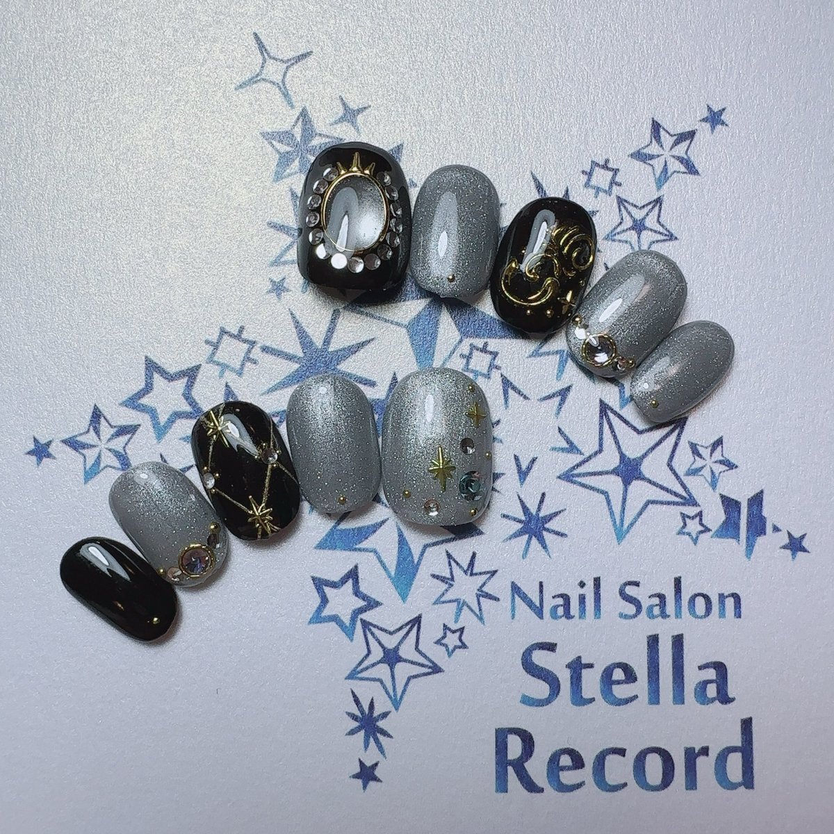 モチーフネイルチップ グリム 毛色のグレーベースに5周年のお衣装イメージを入れてデザインさせていただきました ライブ楽しんでいらしてくださいね #推し活ネイルチップコース nailbook.jp/design/9659059 #Nailbook #ネイルブック pic.x.com/e3ejBqimLO
