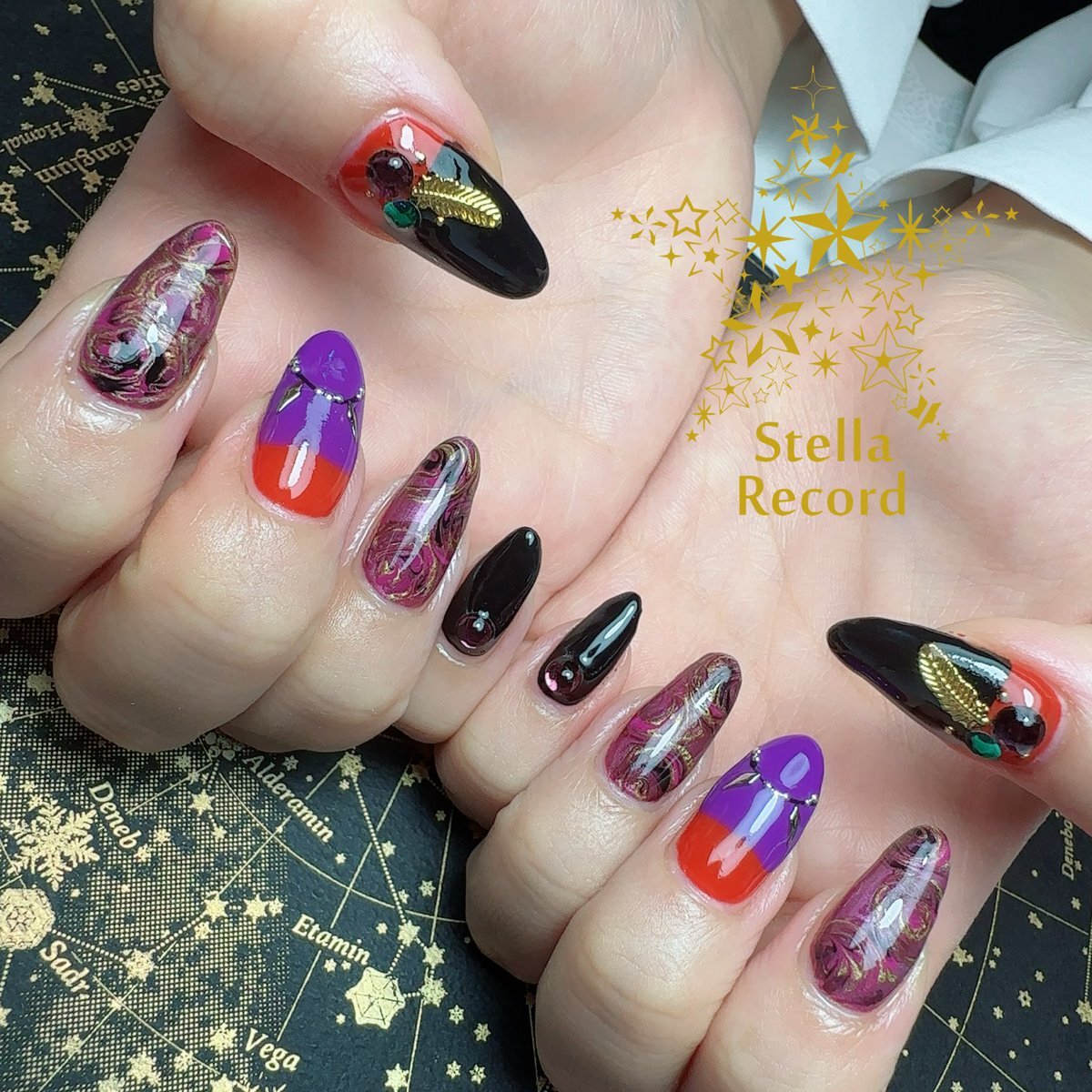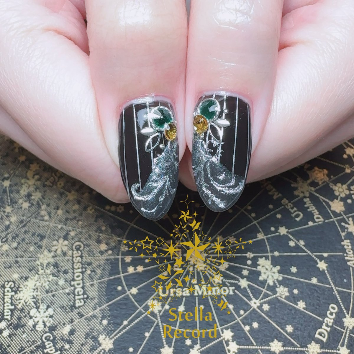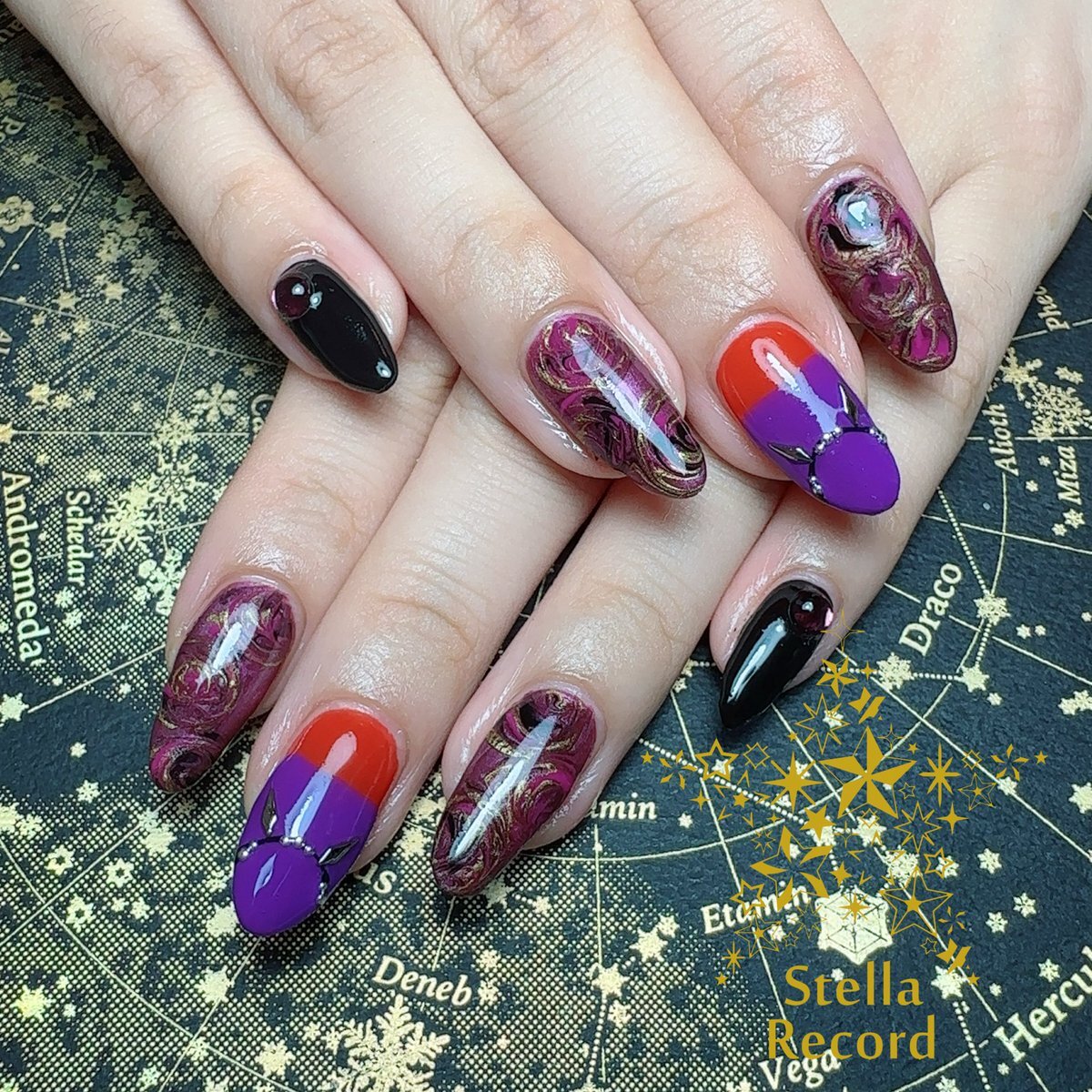 モチーフネイル ドクター・ファシリエ 昨年施術させていただいたパレードのお衣装イメージとカラーを少し色変えして再度施術させていただきました 今年もハロウィン楽しんでいらして下さいね🎃 #推し活ネイルコース150 nailbook.jp/design/9661894 #Nailbook #ネイルブック pic.x.com/gqoQADMPAh