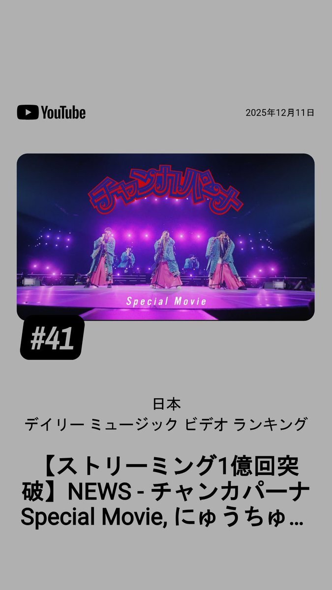 2️⃣0️⃣万⤴︎⤴︎⤴︎ 急上昇も24位✨ #チャンカパーナ #NEWS 【ストリーミング1億回突破】NEWS - チャンカパーナ Special Movie youtu.be/pTpE984GLPI?si… @YouTubeより