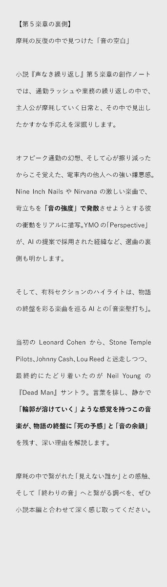 #星野霧詩 小説『#声なき繰り返し』 全楽章公開中!! 🔗lit.link/hoshinokirita 【創作ノートダイジェスト】 第5楽章|摩耗の反復(オスティナート) 400文字程度に要約してみました✍️ #YNO #イエローマジックオーケストラ #NineInchNails #ナインインチネイルズ #Nirvana #ニルヴァーナ pic.x.com/qJKOYAM7wM