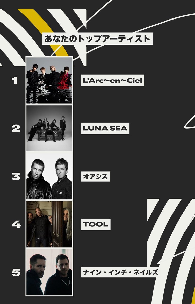 ライブに行った順番で聴き込んでる 感じでした☺️ 1月はL'Arc〜en〜Ciel 2月はLUNA SEA 10月はOasis 12月はTOOLに nine inch nailsは良く聴きます。 #ラルク #LUNASEA #Oasis #TOOL #nineinchnails pic.x.com/s06sSOvytt