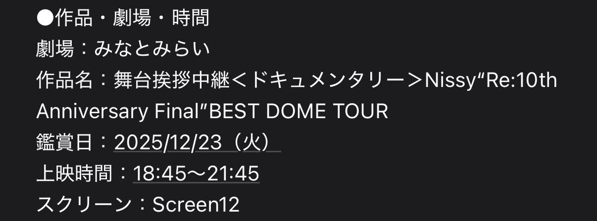 #Nissy 舞台挨拶中継の チケット1枚余ってます🥹💦 ご希望の方リプかDMください🙇♀️ ■映画館:TOHOシネマズららぽーと横浜 ■上映日:2025/12/23 ■時間:14:30〜17:50 ■スクリーン12 ■座席番号:B-15 ■合計金額:4,000円 宜しくお願いします。 #Nissy_Re10thTHEMOVIE