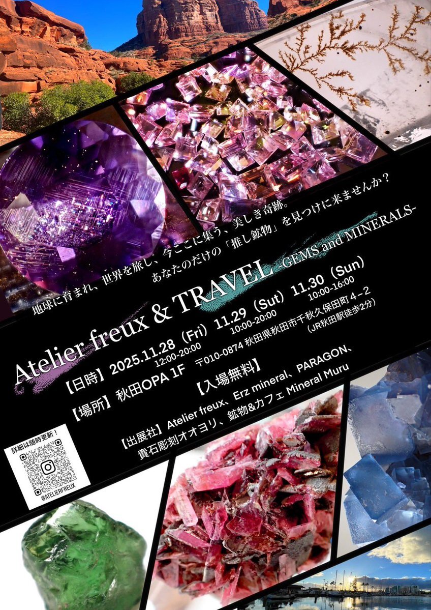 海外鉱業研究会です!⚒ 11/28–30の Atelier freux & TRAVEL-GEMS and MINERALS- に参加しました! 石の販売や、歴代部員達が集めた海研標本 を展示を行っておりました! 今後も各地のマルシェに参加しているので、ぜひお越しください!いしっしーと部員一同お待ちしてます! #OPA #海外鉱業研究会 pic.x.com/yD1E4tHMUB