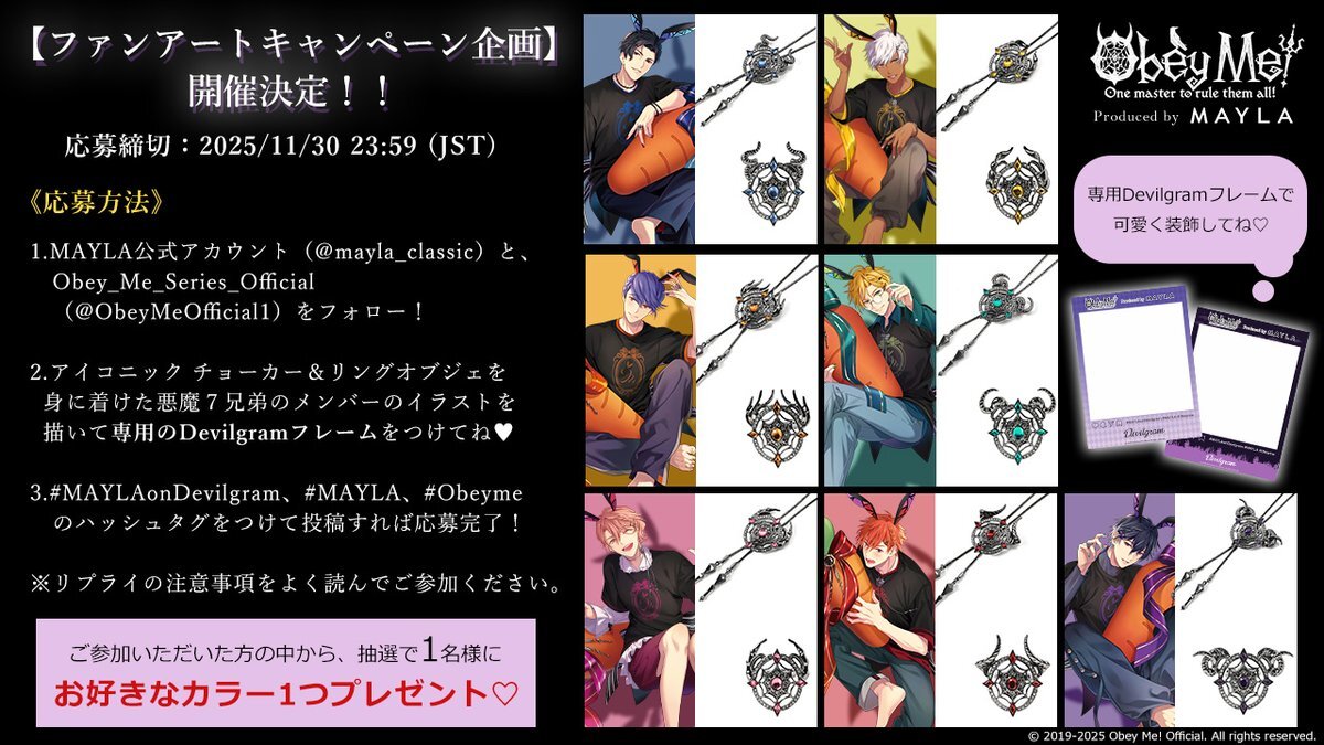 ファンアート企画開催中!😈❣️ イラストを投稿してくれた方に、抽選で新作の「アイコニック チョーカー&リングオブジェ」をプレゼント🎁 #MAYLAonDevilgram #Obeyme pic.x.com/N6NIHkgS9Z x.com/HatoriShinya/s…