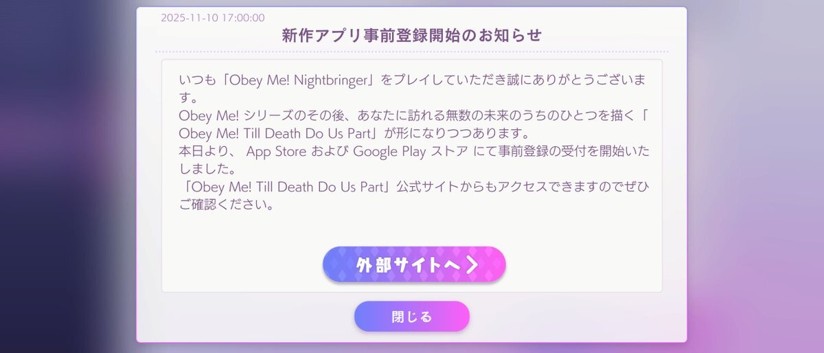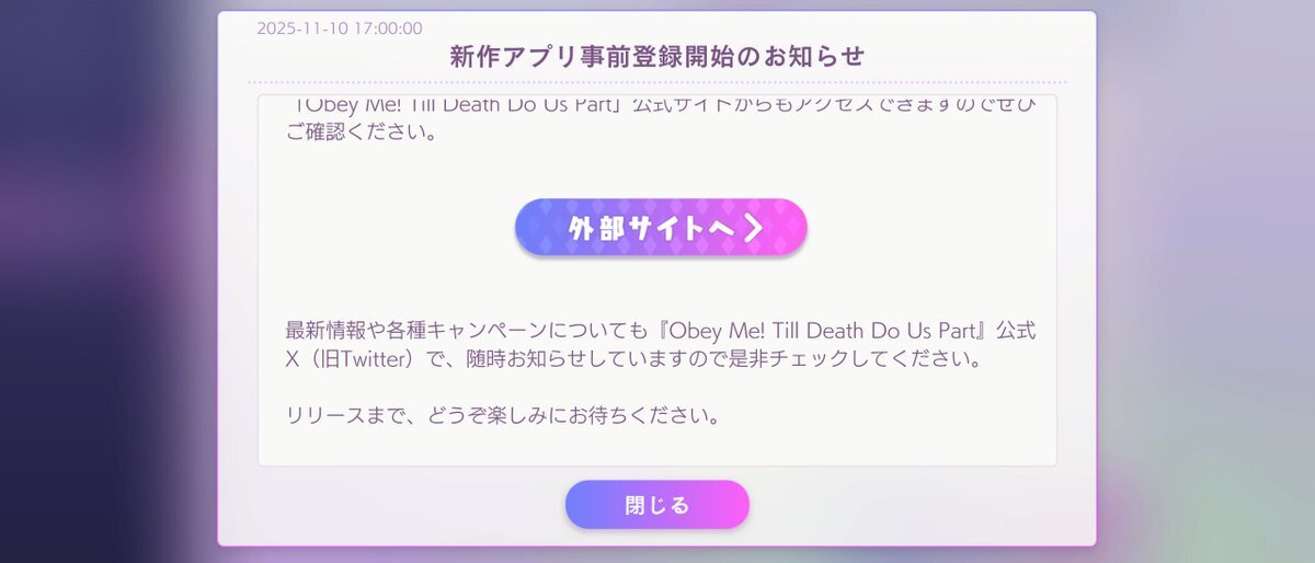 現在、おべいみー/おべないアプリにログインすると、おべてぃるの事前登録案内が表示されるようです😈💍 また、お知らせにも案内が追加されています。 #ObeyMeIDO #おべてぃる #ObeyMe #おべいみー #ObeyMeNightbringer #おべない pic.x.com/1T40ruC1KH