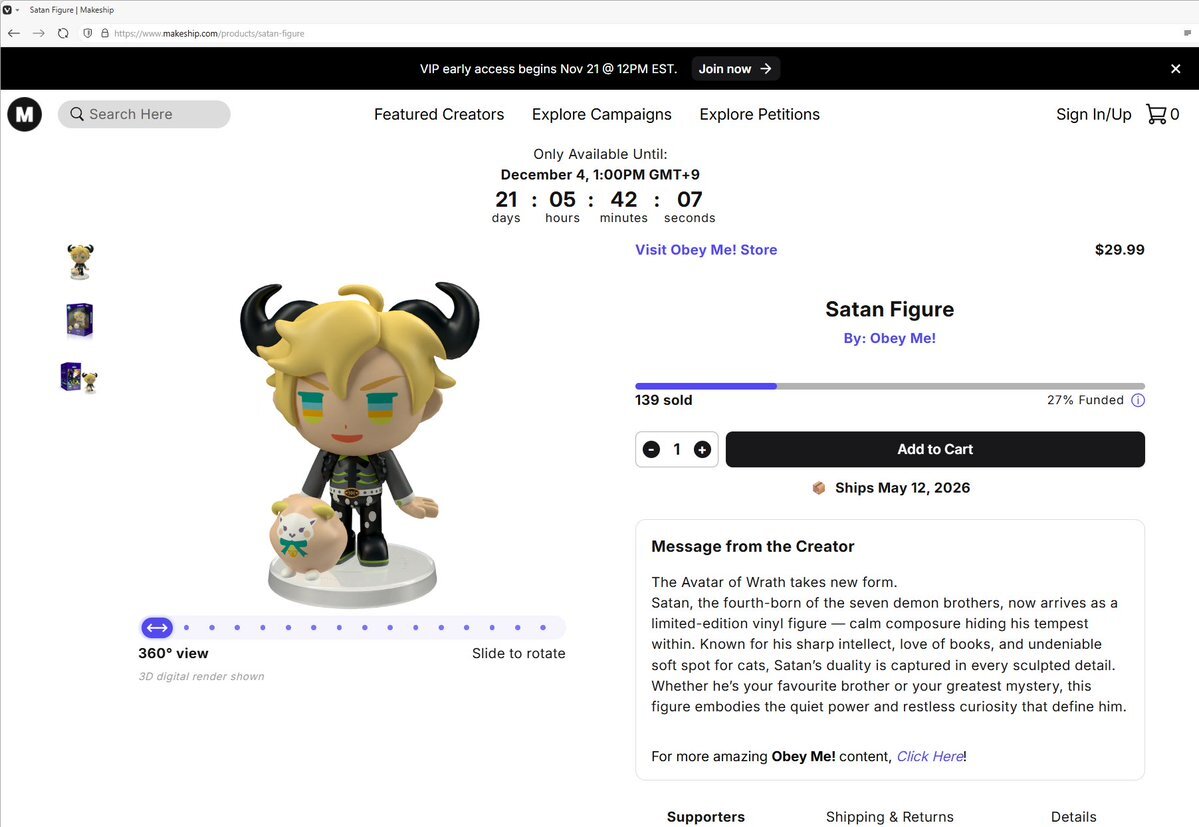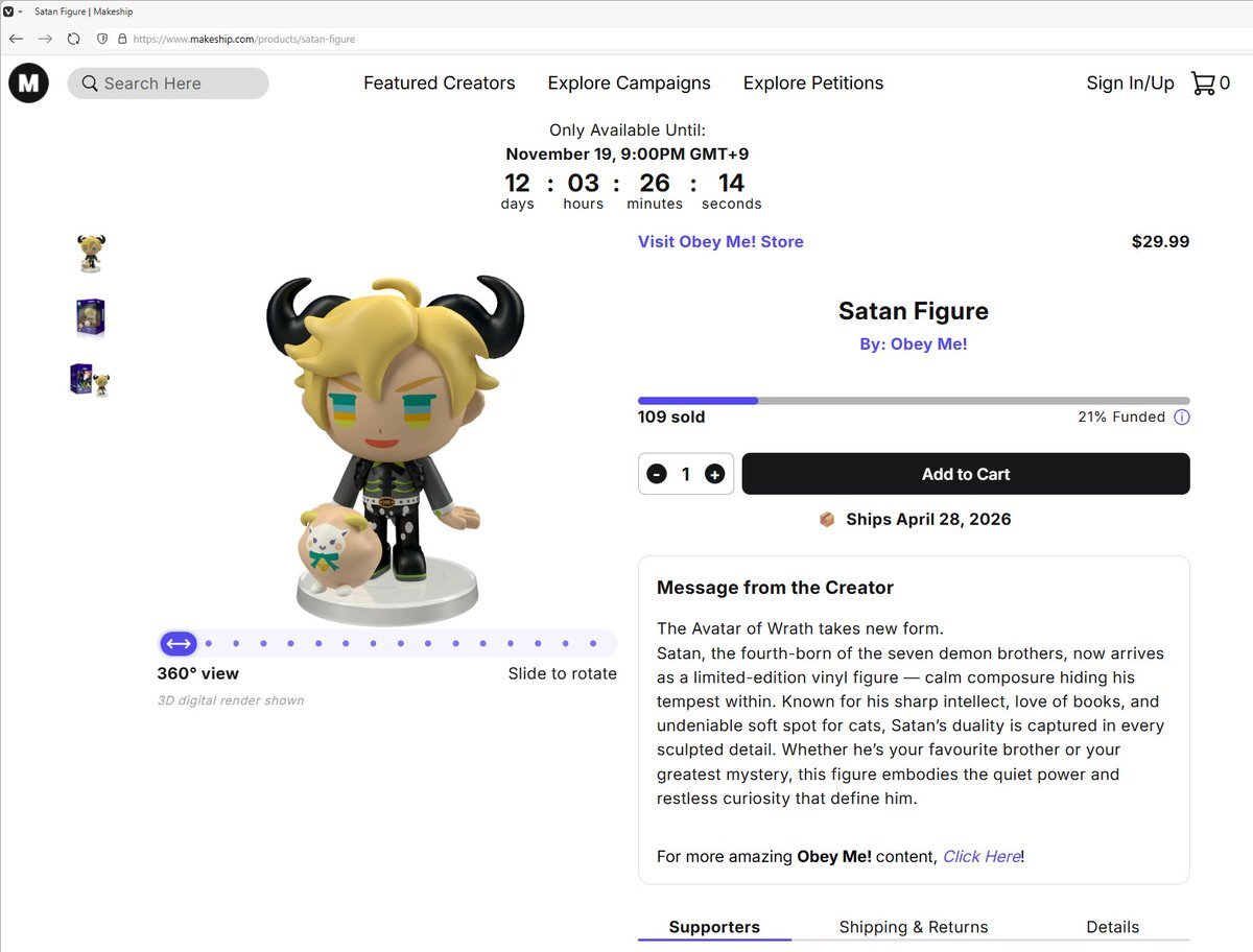 サタンのフィギュアのクラウドファンディング成功まで、500個の受注が必要です。(ぬいぐるみでは200個でした) 現在の受注数は、100個と少し👀 #Makeship #ObeyMe #おべいみー x.com/ObeyMeOfficial… pic.x.com/Md3nPDpLQX