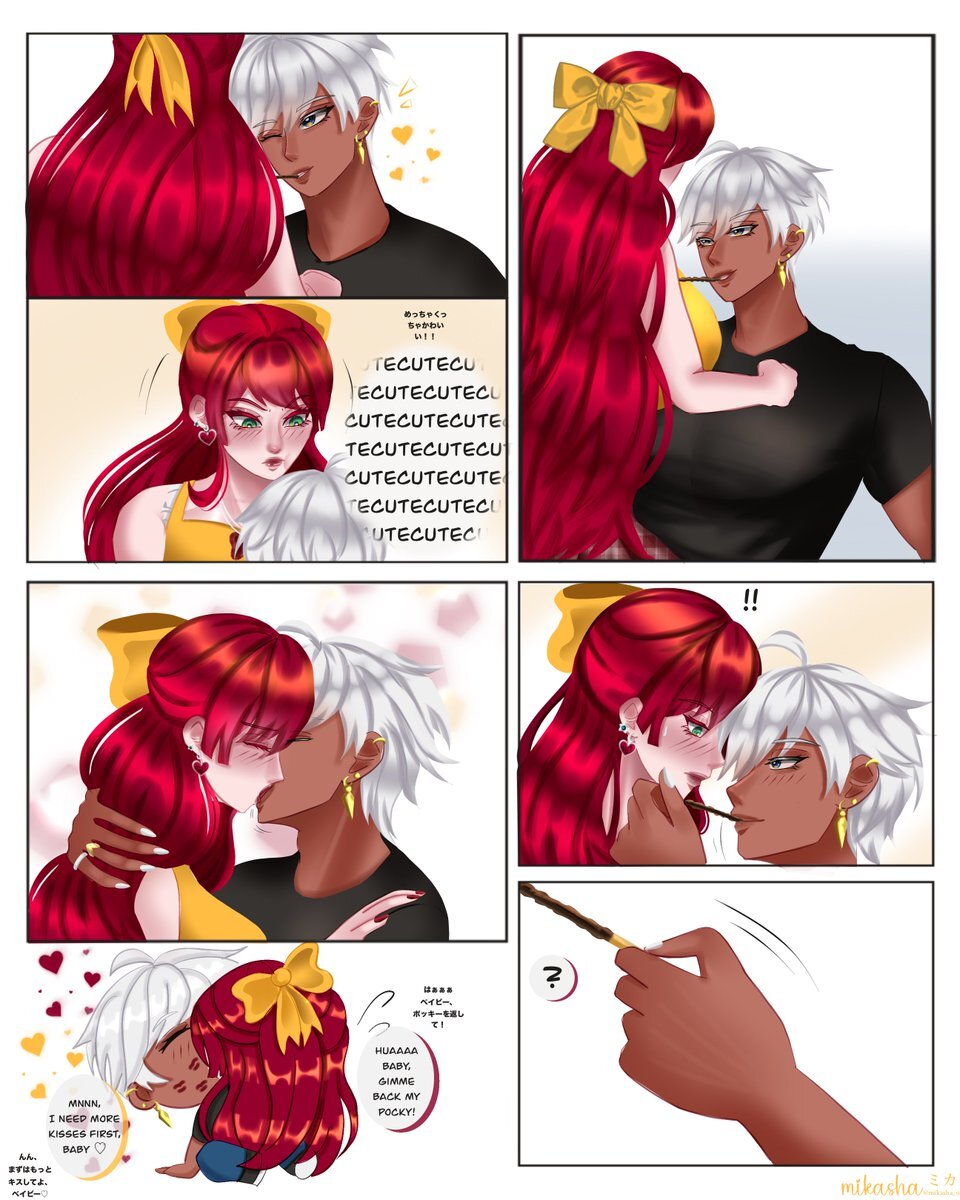 ポッキーの日 💛♥️ On pocky day, Mammon hides Mikako’s stash of pocky. If she wants them back, he wants a pocky kiss 💋 Mikako’s favourite is the blue almond pocky and Mammon is the green almond pepero, like each other’s eyes 💙💚 #obeymemammon #obeyme #obmプラス pic.x.com/ELhbQ5vOgB