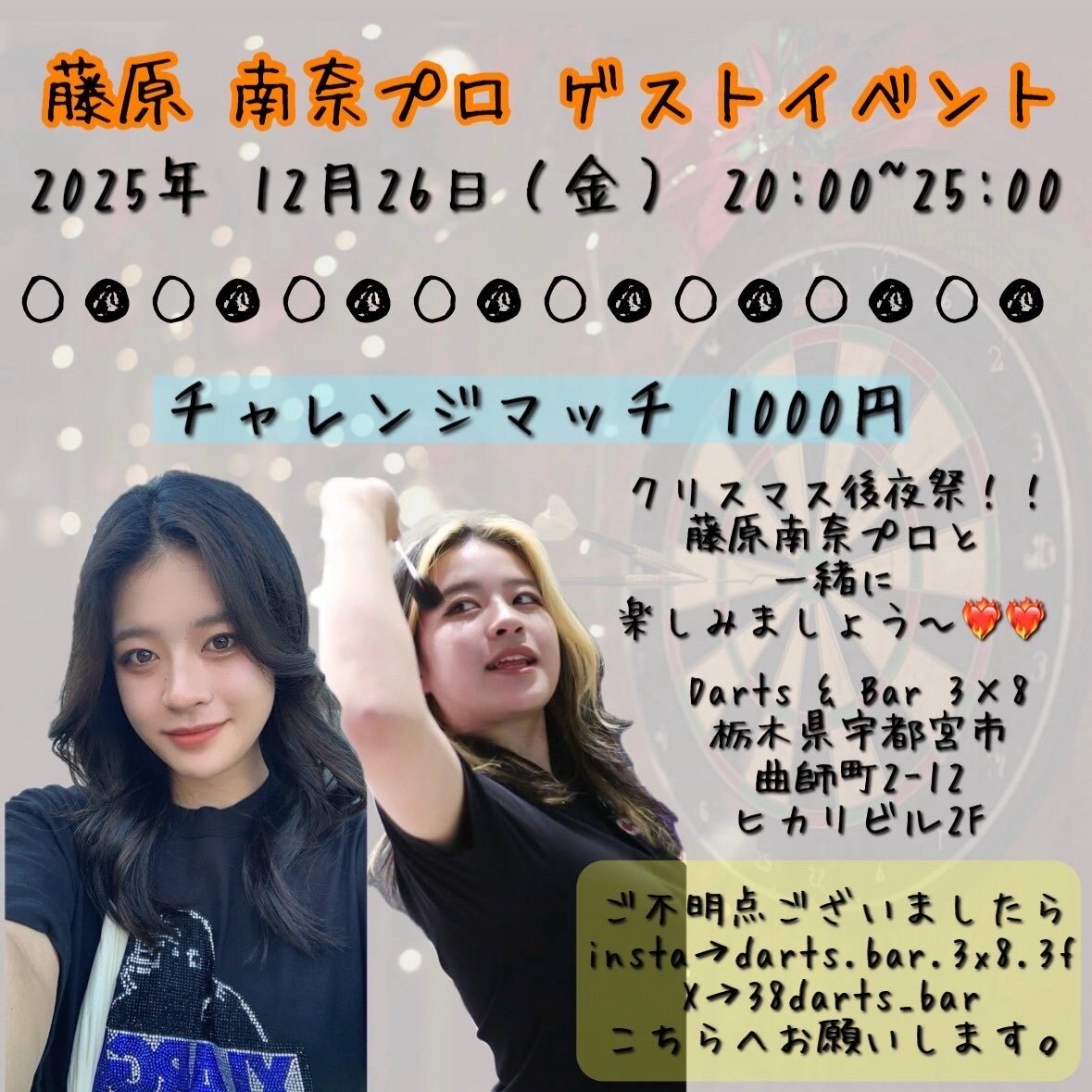 本日も20:00オープンです✨️12/21今年最後のオープントーナメントTHEFINALあります✨️12/26藤原南奈プロゲストイベントあります✨️予約不要です✨️本日もいっぱい投げいっぱい盛り上がりましょ〜✨️本日も皆様のお越しお待ちしております🙇♂️#宇都宮 #DartsLIVE #PHOENIX #オリオン通り #DatsBar pic.x.com/Laf2eJ6Bts
