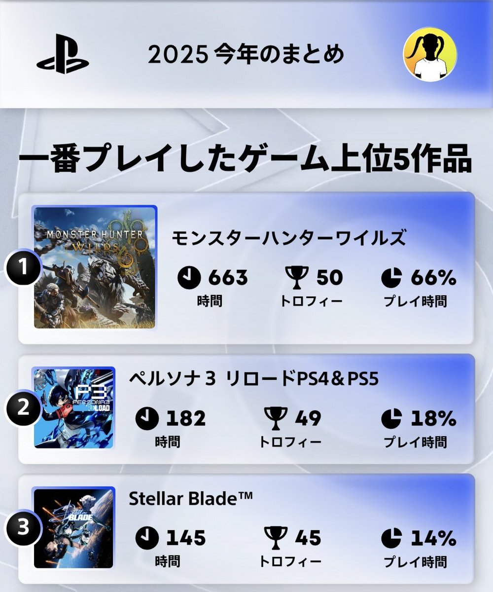 BF6が95時間、アークレイダースが113時間 モンハンは夏前には止めちゃった ヴァンサバは思ってた以上に楽しくDLCを購入これやりながらうとうとするのが最高に気持ちいい デスストは雪山の手前で止まってるので続きをやらなくては! PVP怖いむずいといいつつ、アークレイダースの追い上げが凄い #PS5 pic.x.com/2EpIBOwnUr